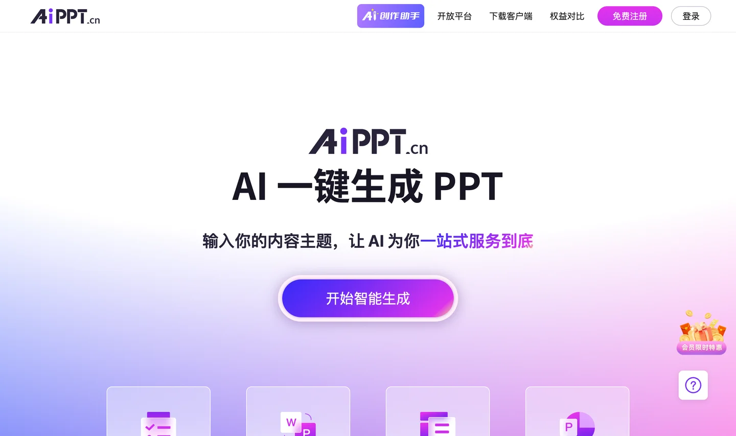 Ai一键生成PPT,百万白领选中的AI办公利器,支持智能在线编辑、文档导入生成PPT、随时随地在线演示、思维导图编辑、海量精选模板、支持多种格式导出