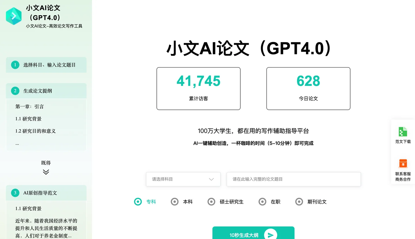 大学生,都在用的论文写作辅助指导平台 AI一键辅助创作,一杯咖啡时间(5-10分)即可完成! 官网入口:https://www.130ai.com/ 无需登录注册,安全储存,加密传输,定时删除 XPaper Ai使用步骤: 仅需4步,选择专业学历与科目、生成大纲、生成全文 第一步:选择专业学历与科目 第二步:生成大纲 第三步:生成全文及开题报告等 第四步:下载论文文章 XPaper